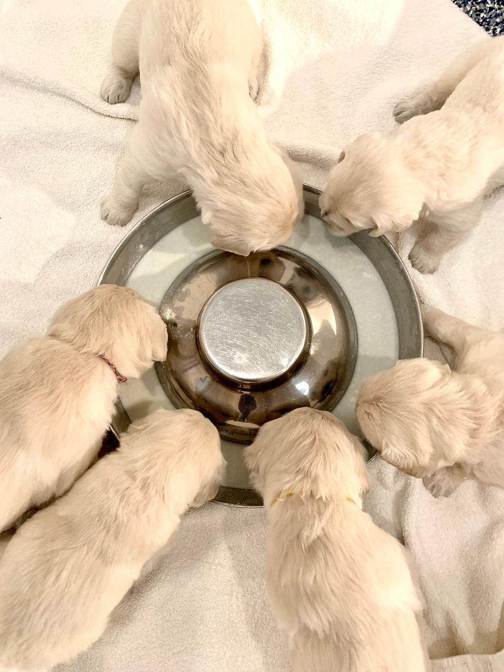 Puppies are five weeks old. They are eating solid food, getting their running legs going, and beginning to explore outdoors. It's a fun time!